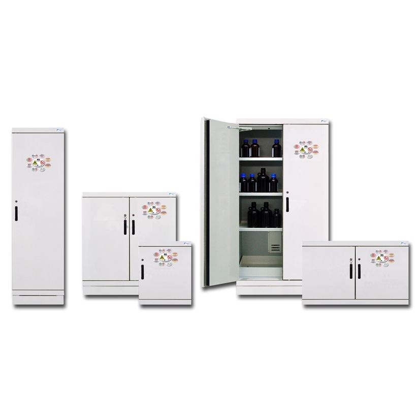 En option: couleur des portes (jaunes ou rouges), caillebotis, étagères et bacs de rétention supplémentaires, tiroirs et bacs, caisson de ventilation / filtration